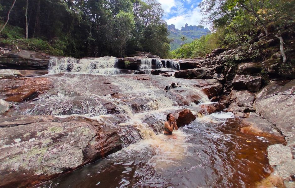 Uma sequência de quedas d'água e poços refrescantes de cor caramelo, perfeitos para um banho revigorante e relaxante após uma longa caminhada. É um oásis de tranquilidade e beleza no coração do Pati.